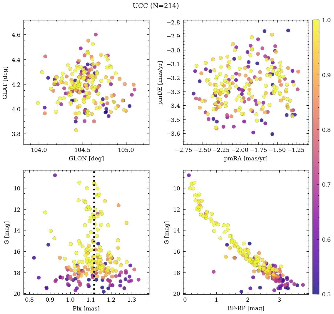 | Cluster | % | RA | DEC | Plx | pmRA | pmDE | Rv | UTI |
