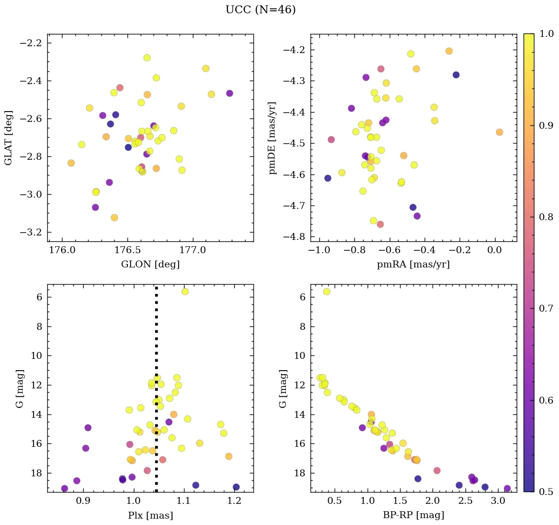 | Cluster | % | RA | DEC | Plx | pmRA | pmDE | Rv | UTI |