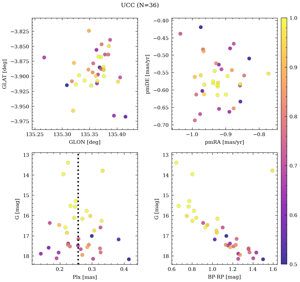 | Cluster | % | RA | DEC | Plx | pmRA | pmDE | Rv | UTI |