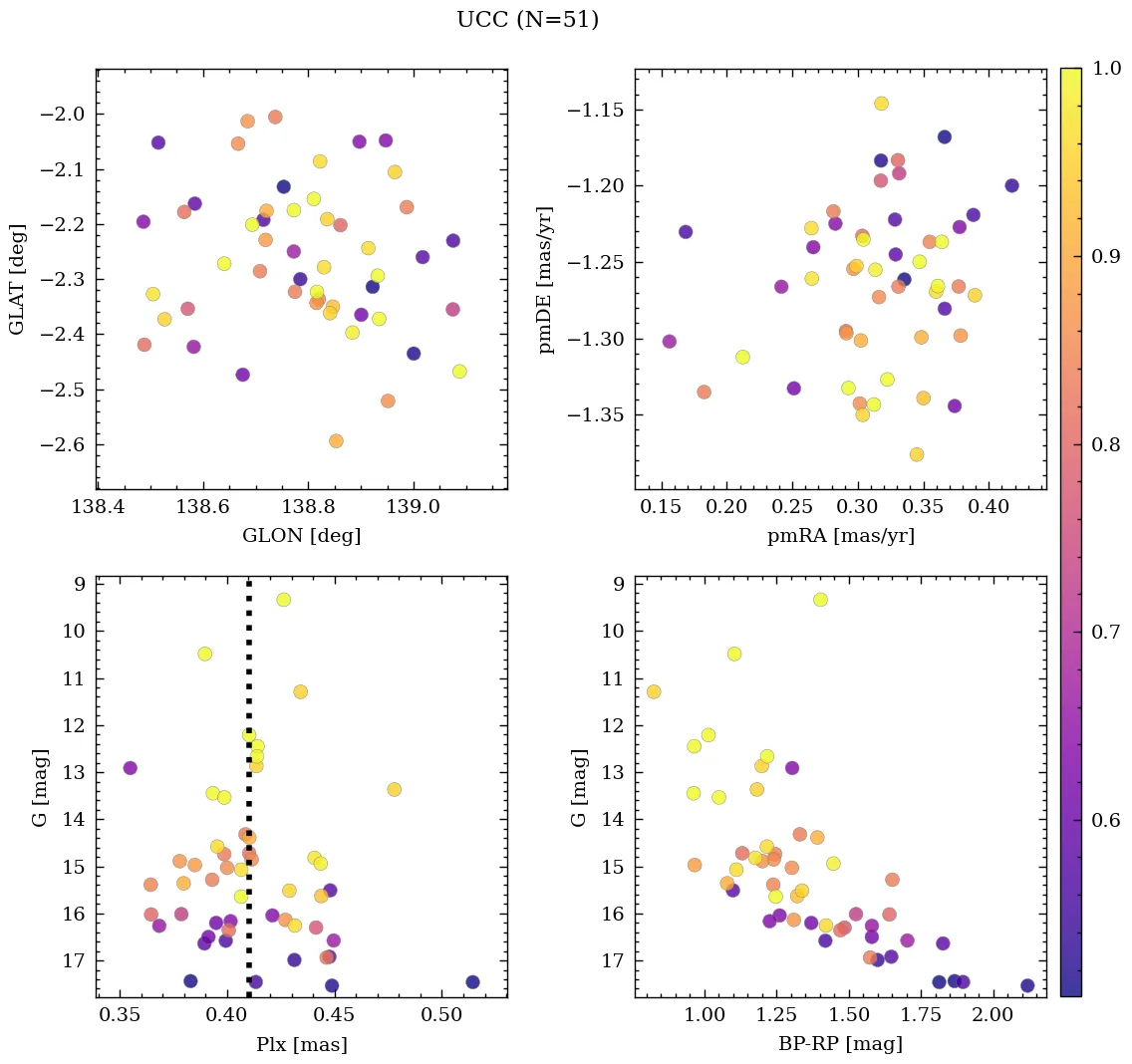 | Cluster | % | RA | DEC | Plx | pmRA | pmDE | Rv | UTI |