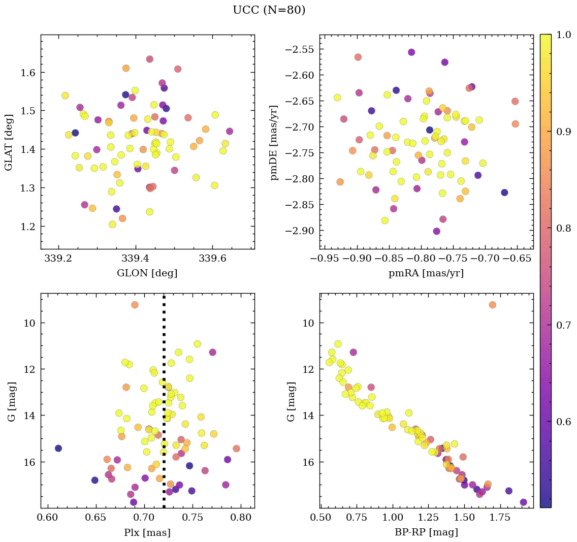 | Cluster | % | RA | DEC | Plx | pmRA | pmDE | Rv | UTI |