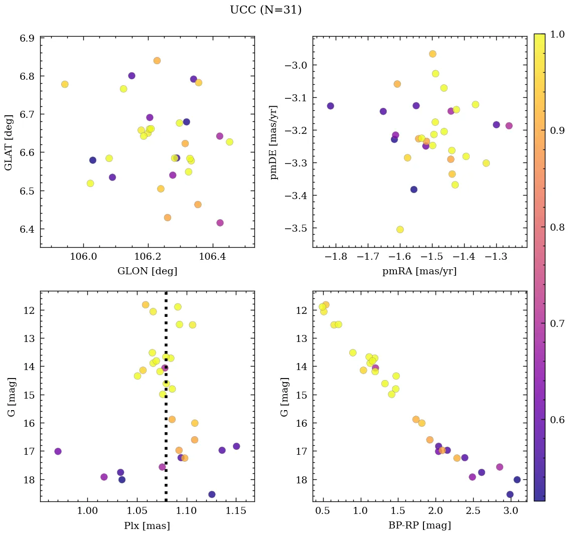 | Cluster | % | RA | DEC | Plx | pmRA | pmDE | Rv | UTI |