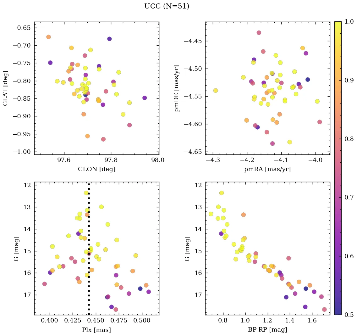 | Cluster | % | RA | DEC | Plx | pmRA | pmDE | Rv | UTI |