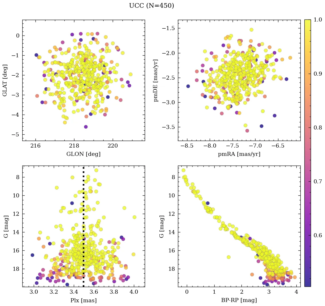 | Cluster | % | RA | DEC | Plx | pmRA | pmDE | Rv | UTI |
