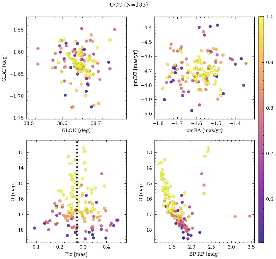 | Cluster | % | RA | DEC | Plx | pmRA | pmDE | Rv | UTI |