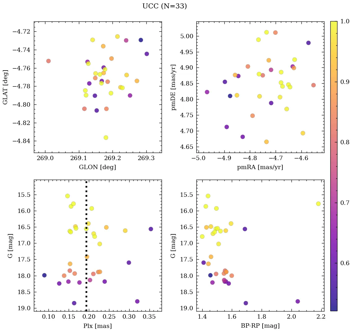 | Cluster | % | RA | DEC | Plx | pmRA | pmDE | Rv | UTI |