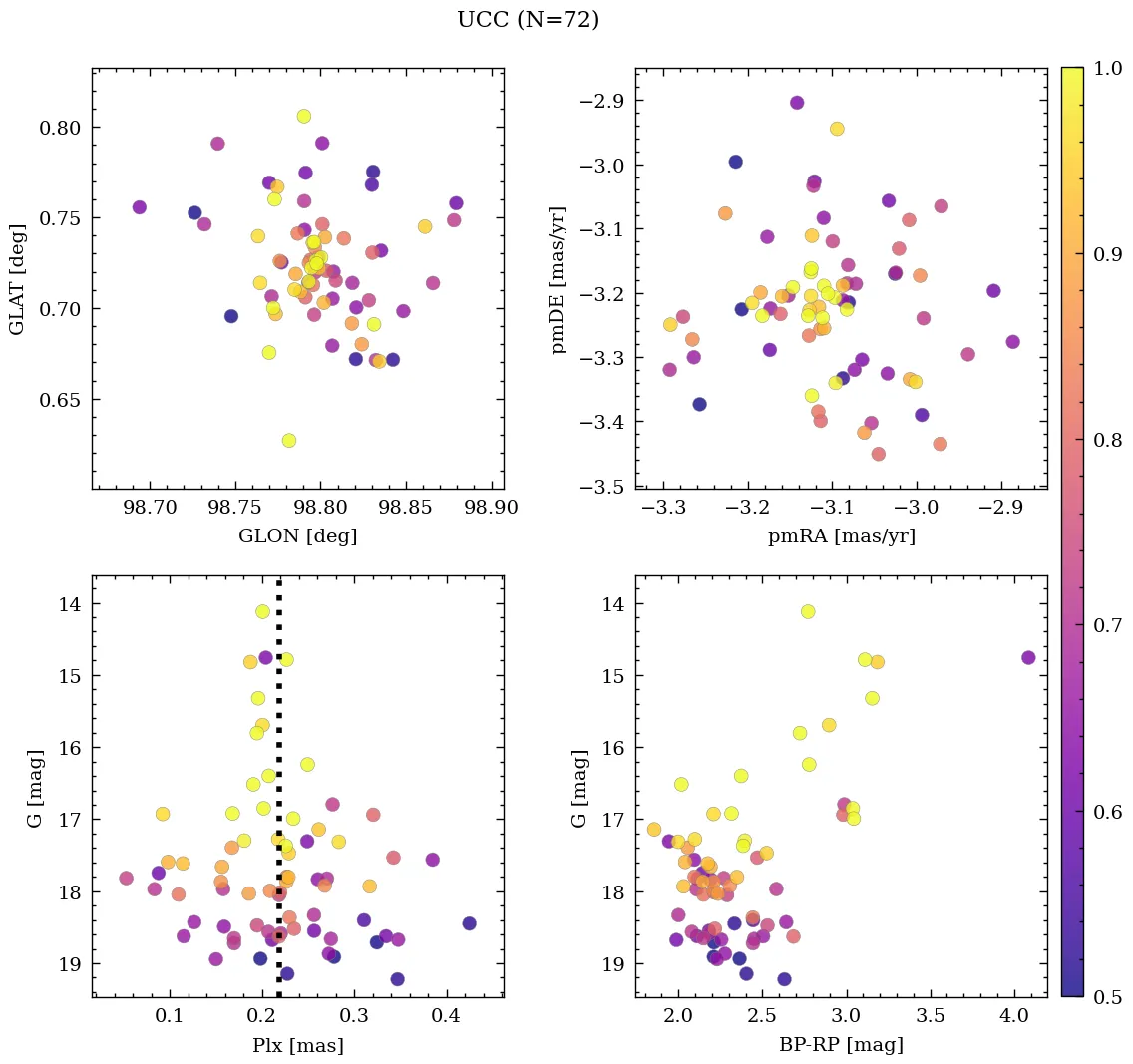 | Cluster | % | RA | DEC | Plx | pmRA | pmDE | Rv | UTI |