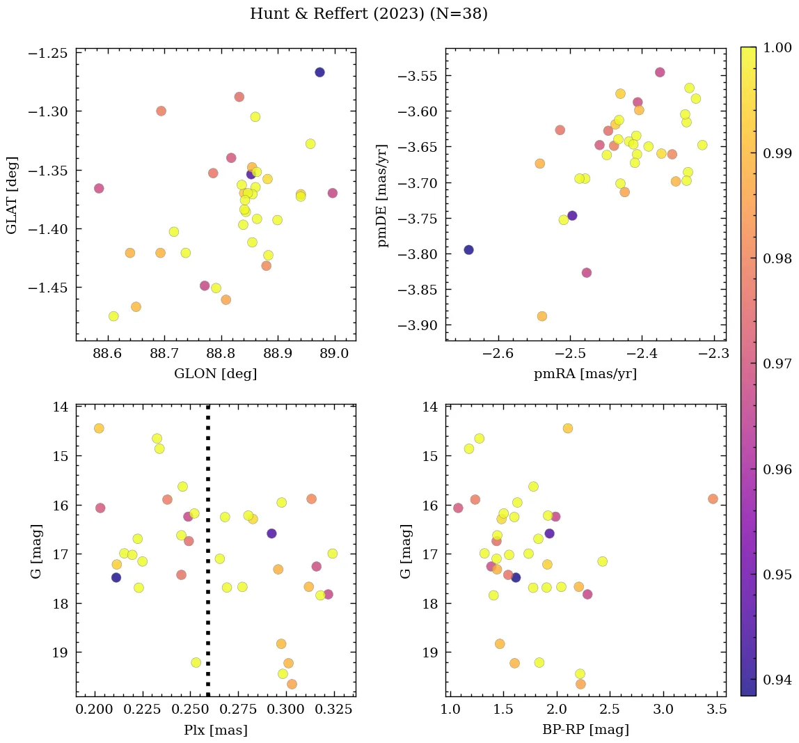 | Reference | Year | RA [deg] | DEC [deg] | Plx [mas] | pmRA [mas/yr] | pmDE [mas/yr] | Rv [km/s] |