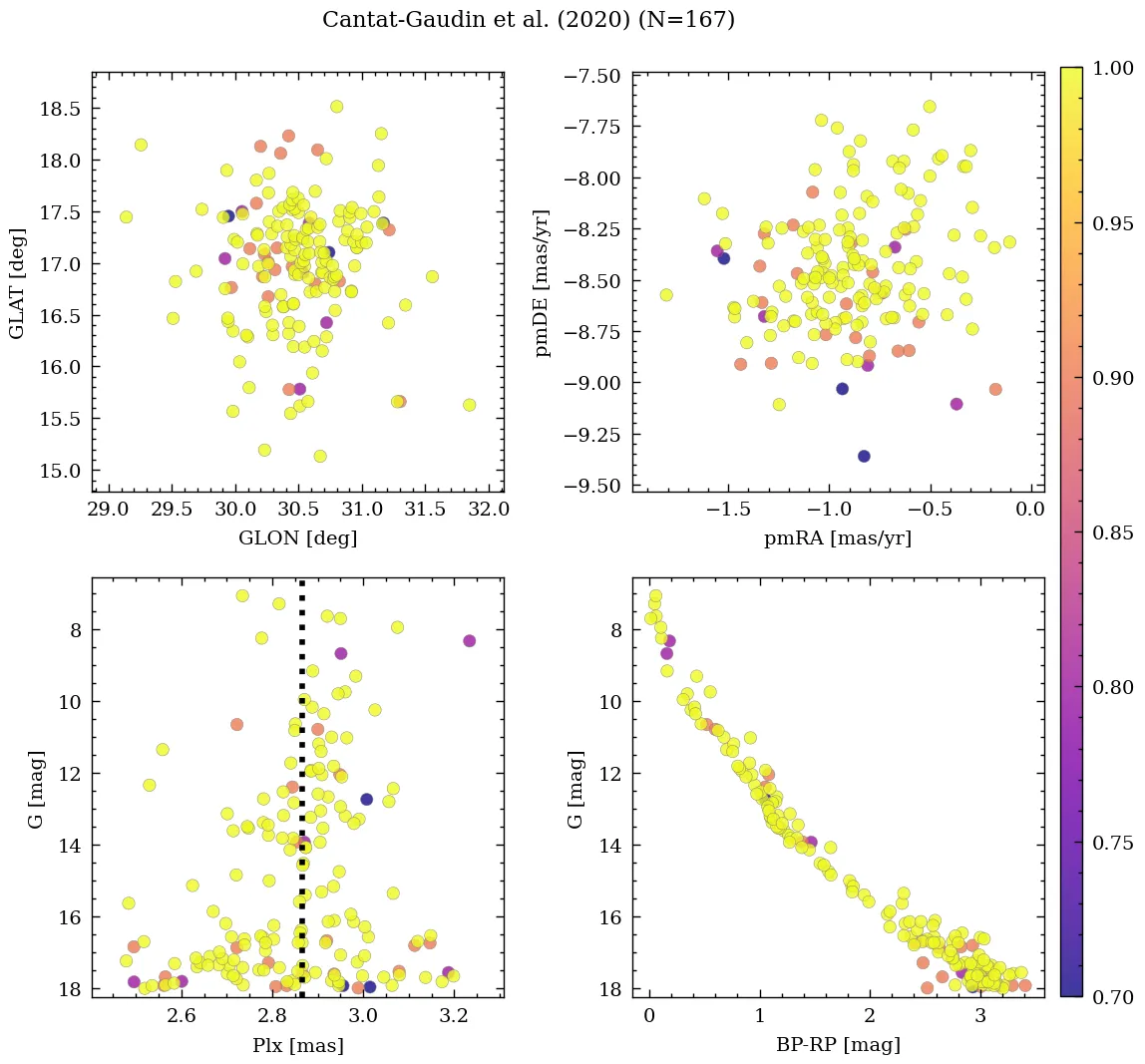 | Cantat-Gaudin et al. | 2020 | 266.554 | 5.615 | 2.868 | -0.909 | -8.52 | â |