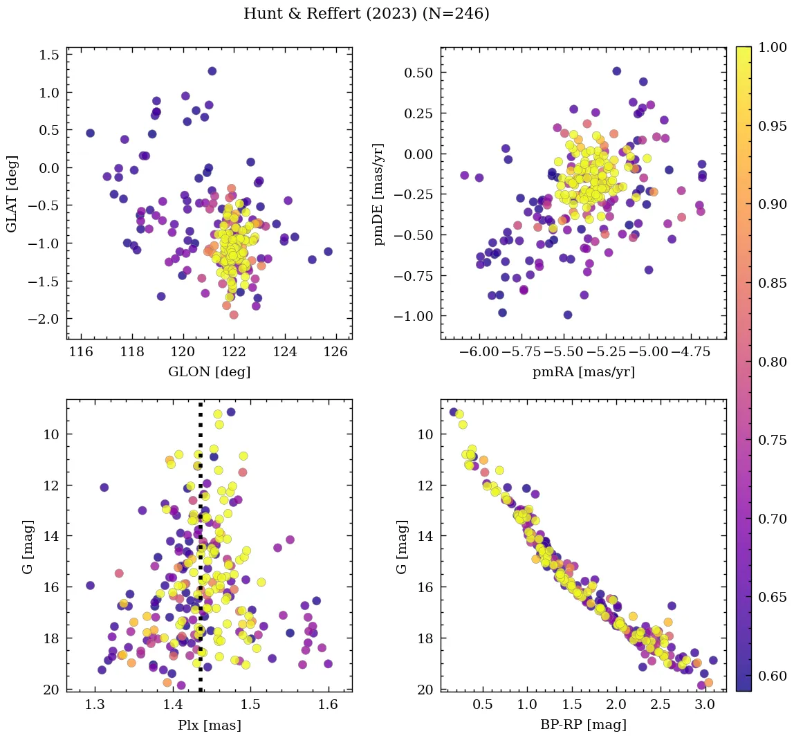 | Cantat-Gaudin & Anders | 2020 | 10.805 | 61.774 | 1.432 | -5.373 | -0.093 | â |