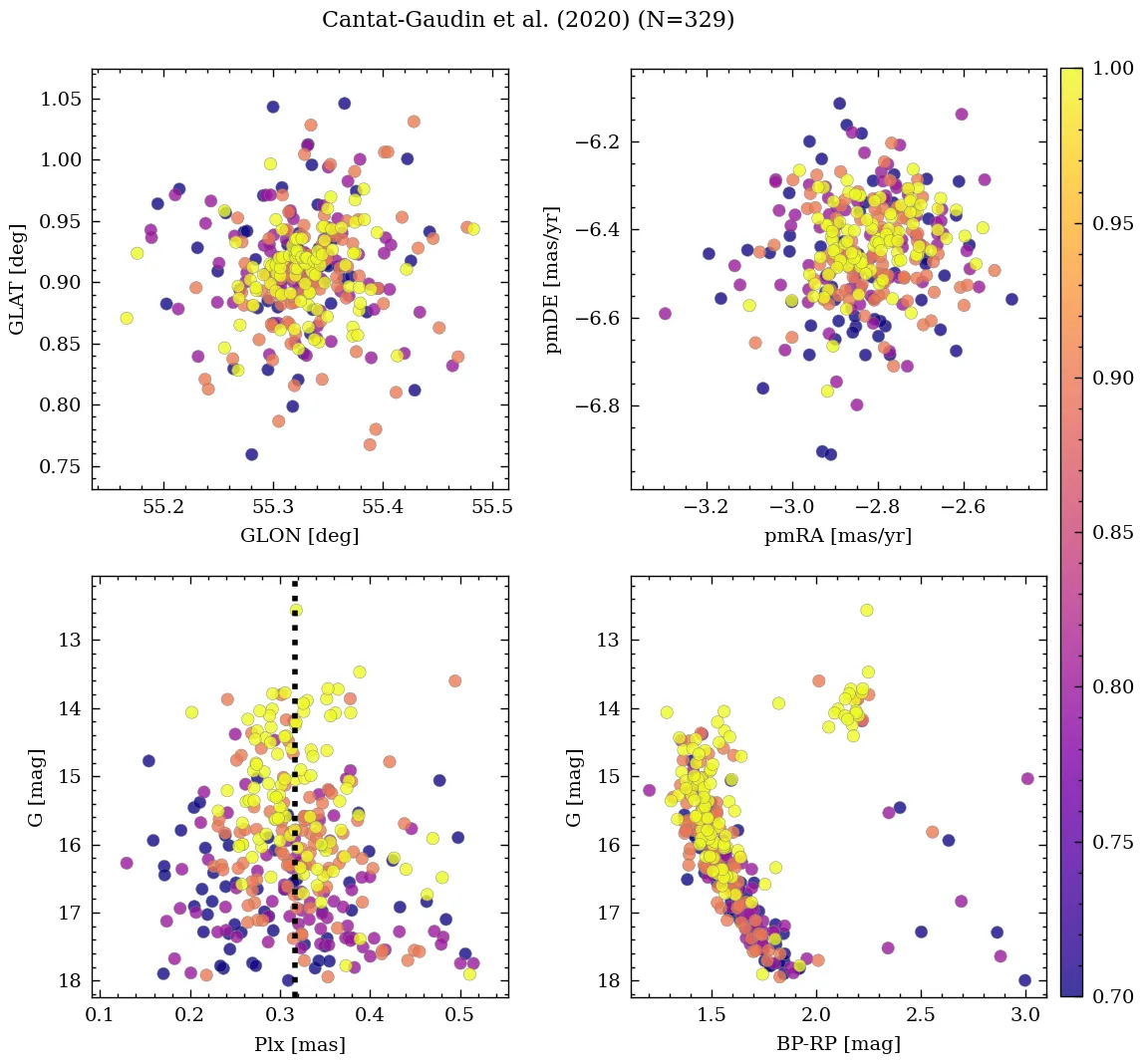 | Cantat-Gaudin & Anders | 2020 | 292.651 | 20.262 | 0.309 | -2.814 | -6.438 | β |