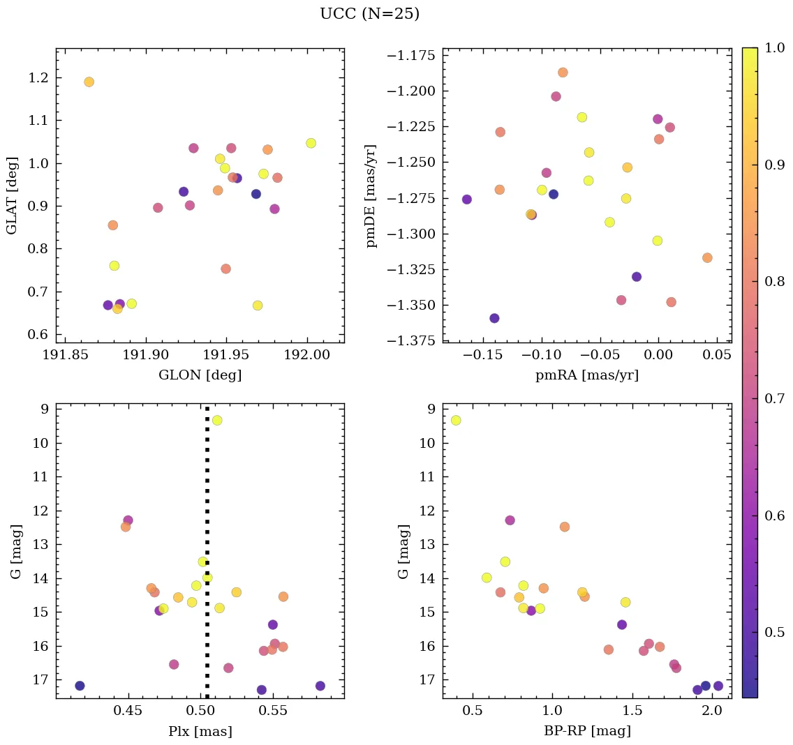 OC 0318 is a sparse, loose object of intermediate C3 quality. Its parallax locates it at a relatively close distance, above the mid-plane, affected by moderate extinction. It is catalogued as a metal-rich, very young cluster (see Parameters). It is rarely studied in the literature.