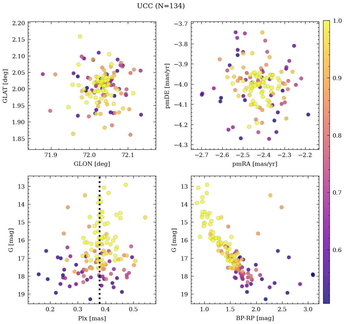| Cluster | % | RA | DEC | Plx | pmRA | pmDE | Rv | UTI |