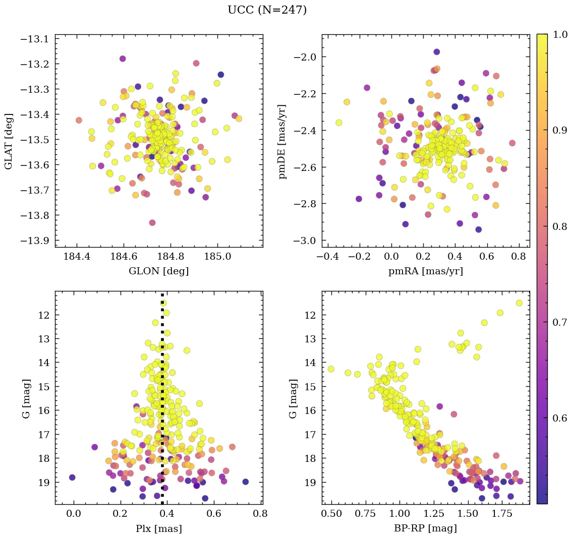 | Cluster | % | RA | DEC | Plx | pmRA | pmDE | Rv | UTI |