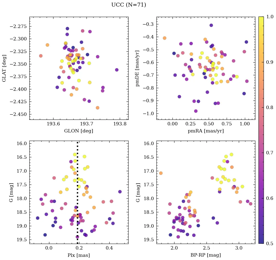| Cluster | % | RA | DEC | Plx | pmRA | pmDE | Rv | UTI |
