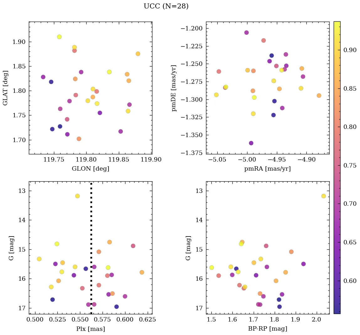 | Cluster | % | RA | DEC | Plx | pmRA | pmDE | Rv | UTI |