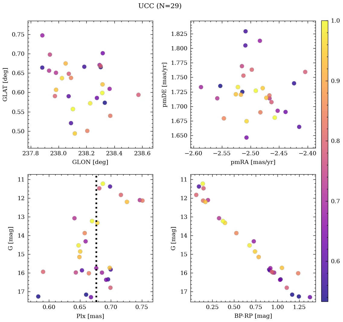 | Cluster | % | RA | DEC | Plx | pmRA | pmDE | Rv | UTI |